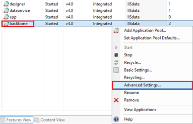 - A list will appear on the right side where you can see all the application pools. Right-click the application pool ‘Backbone’ and select ‘Advanced Settings…’.