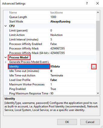 - A window will open where you can fill in the credentials of the user you want to assign to the application pool.