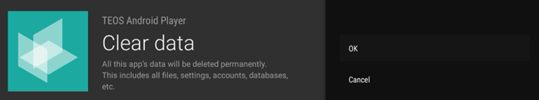 This guide explains how to clear the TEOS Android Player app data on a device. Clearing the app data will remove all stored data of an application, which can resolve issues when problems occur with the application.