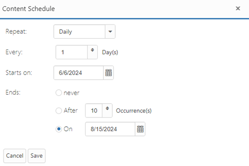 Daily: With this option, the content schedule will play every day until the schedule ends.