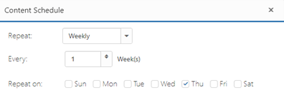 Weekly: With this option, the content schedule will play every week on the selected days until the schedule ends.