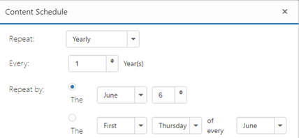 Yearly: With this option, the schedule will play once a year on a specific date, or on the first, second, third, fourth, or last weekday of a selected month.