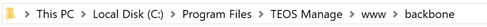 - Open File Explorer and navigate to “Program Files\TEOS Manage\www\backbone”. Depending on your system configuration, the drive letter (e.g., “C:\”) may differ. Search accordingly.