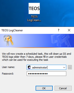 Located at the bottom of the page: "TEOS LogCleaner v1.0.1.zip" - Once you have downloaded the LogCleaner, run the installer on your server. When the setup starts, a pop-up will appear. Enter your administrator account name and password, then press “OK”.