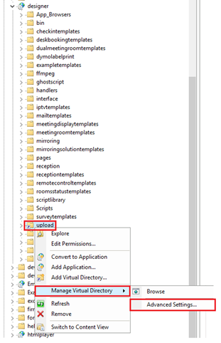 - Right-click the Upload entry and select: Manage Application > Advanced Settings…
