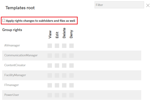 4. To configure rights, you have two options: 1. Setting rights for specific content or a folder. 2. Setting rights for a folder and everything included in the folder. This option is called “Apply rights changes to subfolders and files as well”. To use this option, tick the checkbox before changing the rights.