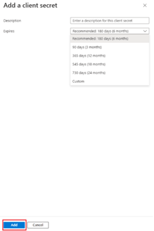 - In the tab on the right-hand side, fill in a description and an expiration date for the secret. Once this has been done, select ‘Add’.