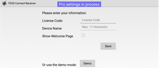 5. Demo; you can use the demo mode, which enables TEOS Connect Receiver for a 30-day trial.