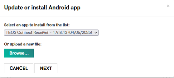 Select the “Browse” option to upload the downloaded TEOS Connect Receiver application.