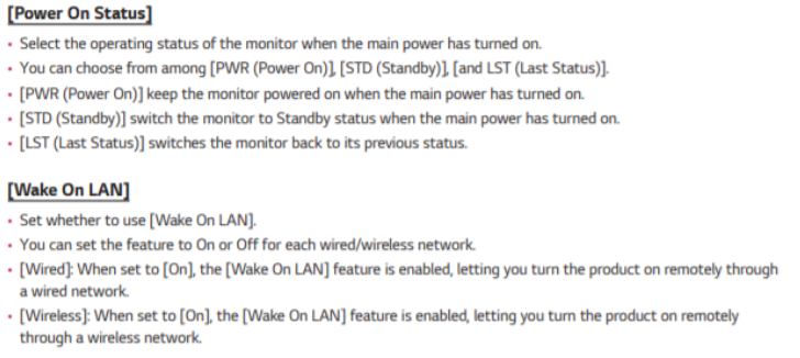 The LG platform includes support tools for managing systems, such as Simple Network Management Protocol (SNMP), which enables monitoring of TVs on the network for maintenance and administration. The Wake-on-LAN feature allows communication while powered off, enabling remote software updates.