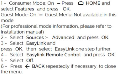 Use EasyLink Remote Control if you want devices to communicate but do not wish to operate them using the TV remote. You can switch EasyLink Remote Control on or off as needed.