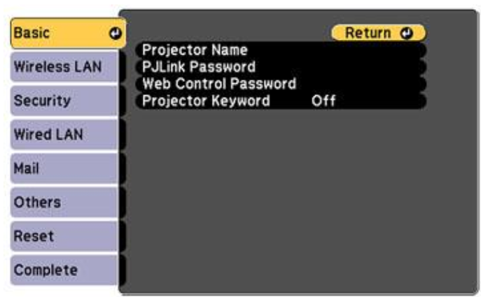 - Projector Name: Enter a name (up to 16 alphanumeric characters) to identify the projector over the network.