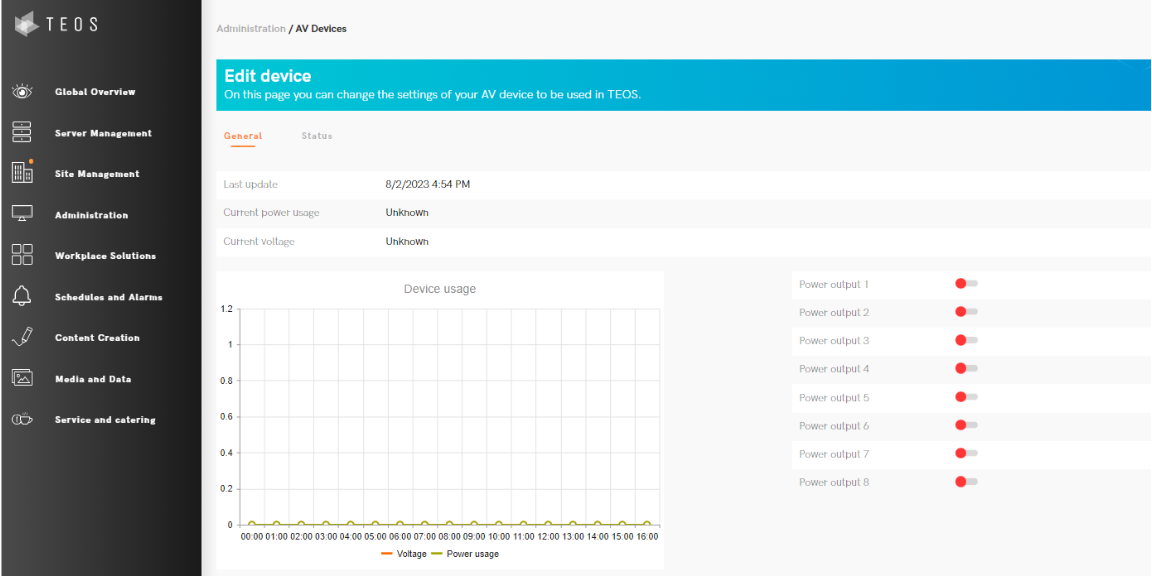 Since version 3.2 of TEOS, a new device type has been introduced — the PDU (Power Distribution Unit). It provides real-time power consumption data (in watts and voltage) and allows you to configure plug activity.