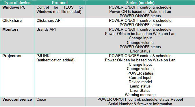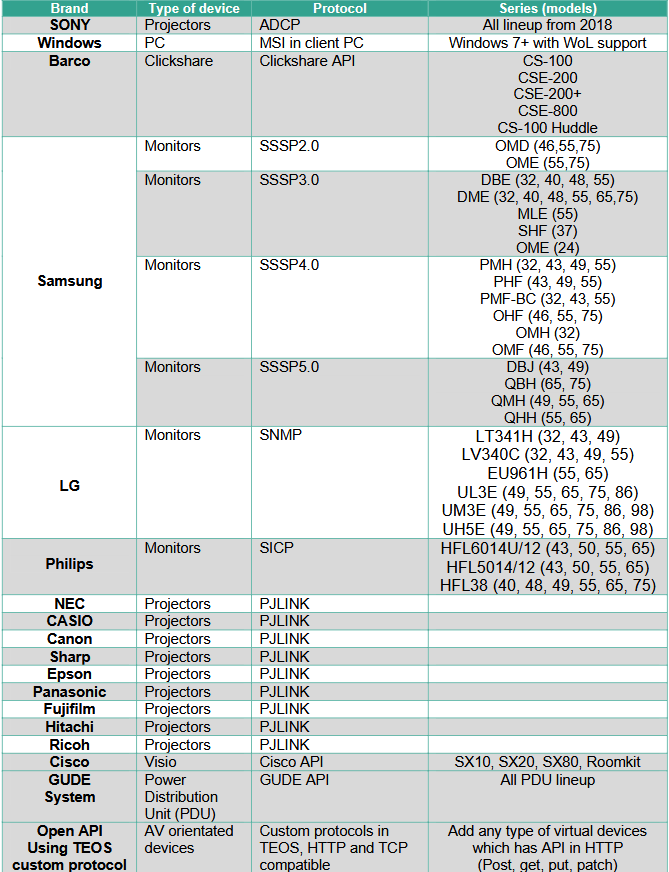 Manage for TEOS can integrate third-party devices for control purposes only. This means that the only compatible license with these devices is the Control License (TEM-CO10). To display signage content on a third-party device controlled by Manage for TEOS, a Player license is required.