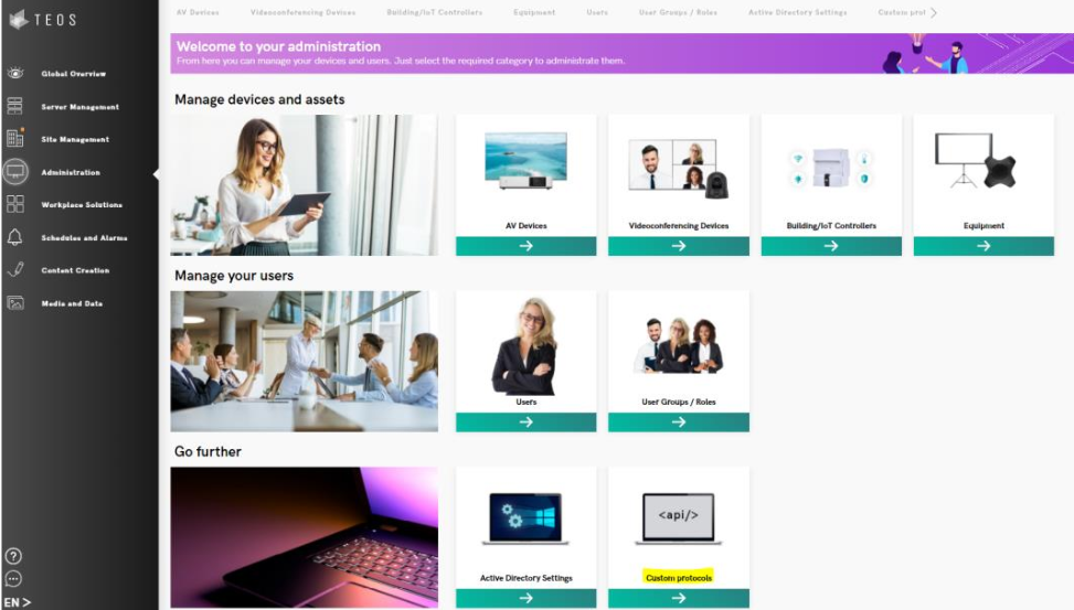 From version 3.0 onwards, you can add custom protocols to use devices not natively integrated into TEOS. Go to Administration > Custom Protocols in TEOS.
