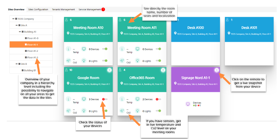In “Site Management” → “Site Overview”, you can view your group hierarchy, check the device status, power devices on/off, and access the virtual remote from this overview.