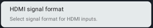 - Select “Inputs > External inputs > HDMI signal format” and set the HDMI inputs in use to “Standard format.”